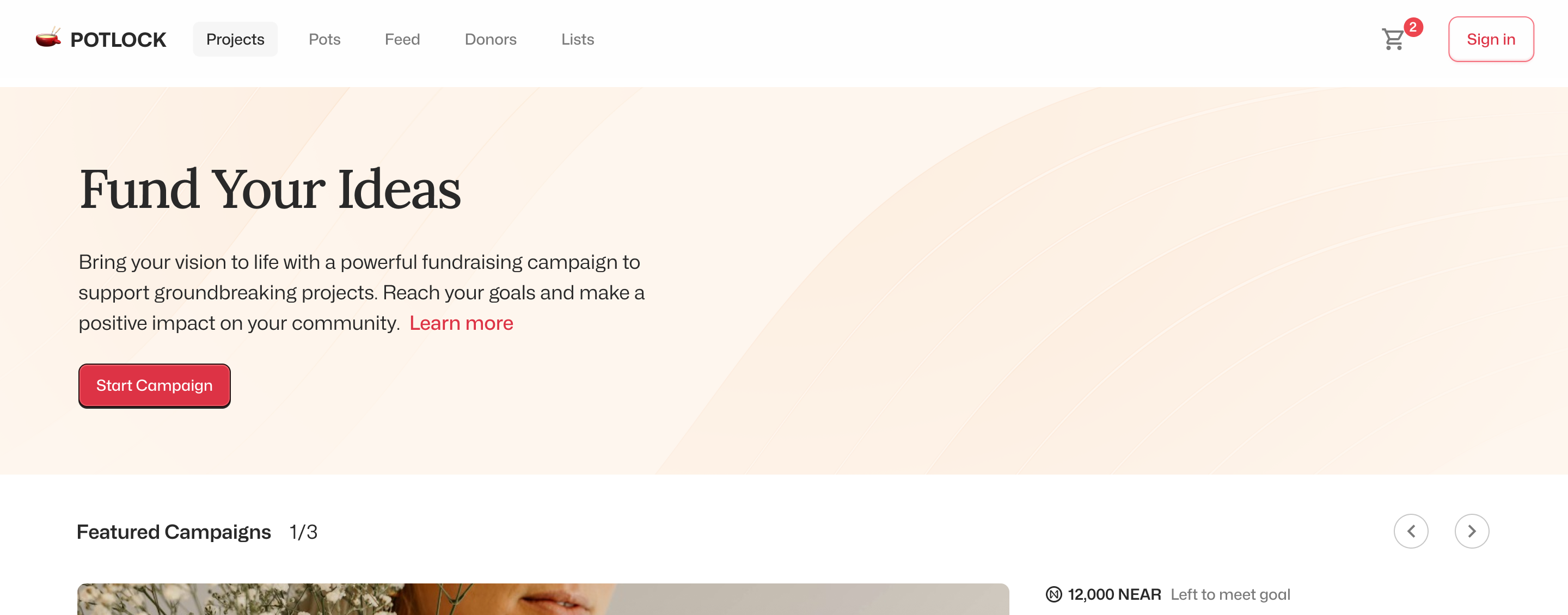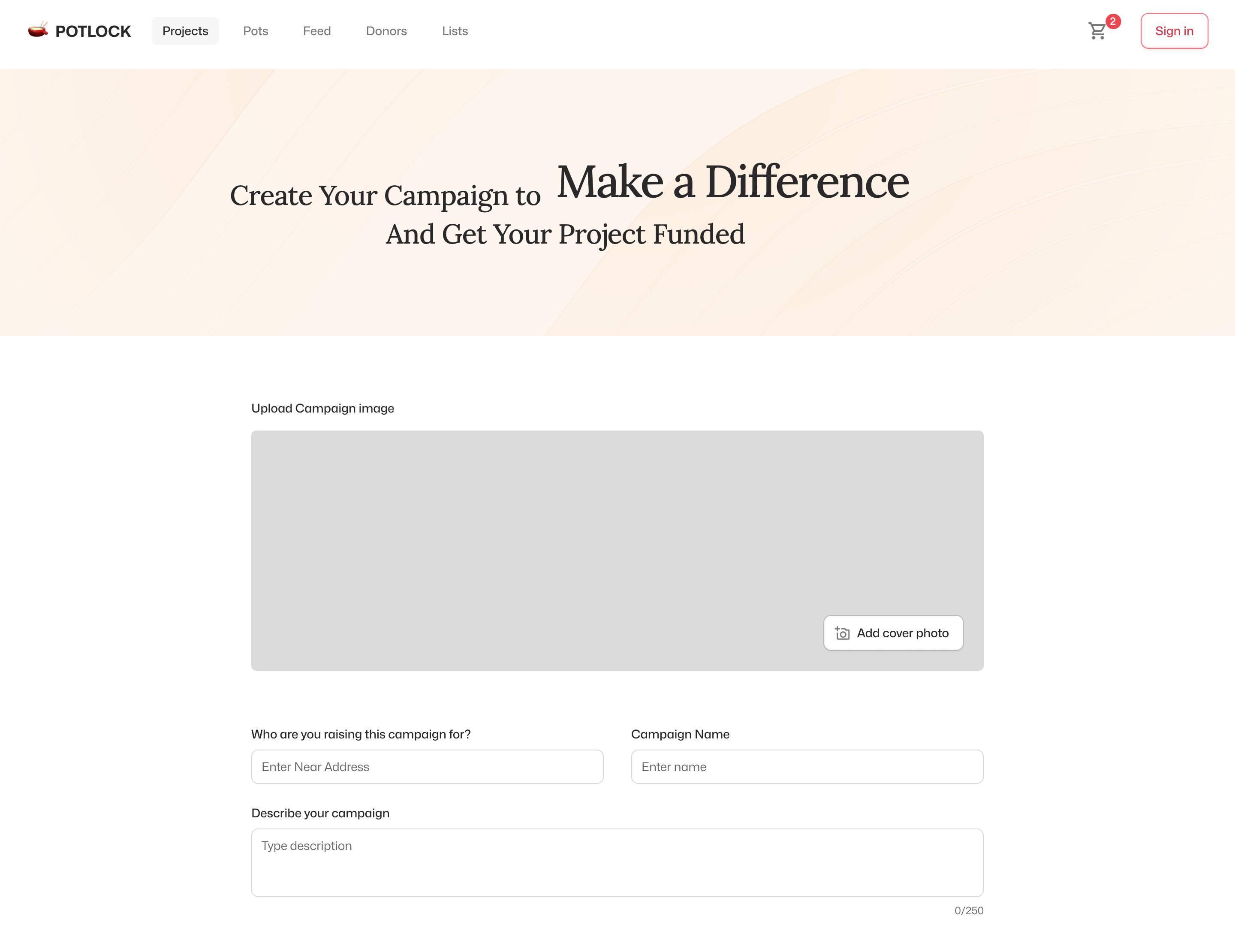 Access the Create Campaign CTA: Go to the POTLOCK website and find the Create Campaign call-to-action (CTA) located in the hero section of the Explore Campaigns Page. This will direct you to the campaign creation interface.