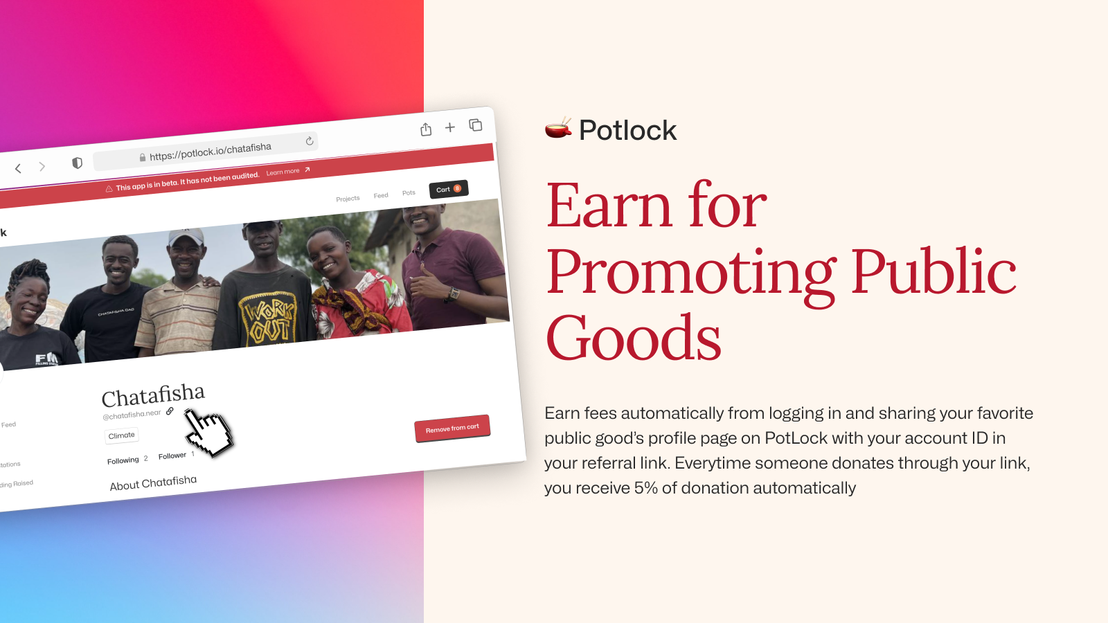 One of the best things about POTLOCK, is we are aligning incentives for citizens, and those helping grow the pot, by doing automatic on chain referrals + payouts. And its super easy. All you need to do is go to your favorite project page when you are logged in and click the share button.